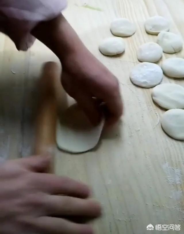 5.成型: 将制好的面放入压面机上压制,每次压面不能太多,一般压面10边,搓条下机子,檊成元片,中间厚边缘薄,包合法包住馅心,要求大小一致,上下分度值2g,不露馅,不褶皱,